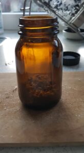 Daheim zerkleinere ich die Knospen, gebe sie in ein Glas, fülle mit dem Lösungsansatz auf, schüttele vorsichtig und stelle den Ansatz mit Beschriftung für 4 Wochen zur Seite. Jeden Tag wird dann der Ansatz leicht geschüttelt.