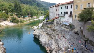 Weiter flussabwärts werden die Wassermassen wilder, da graben sie sich tief in die Felsen ein und tosen zu Tal. Bevor der Fluss breiter und gemächlicher wird, passiert er den Ort „Kanal“. Dort hat er eine schmale, tiefe Schlucht zwischen die Kalkfelsen gegraben oder besser ausgespült. Hier springen Turmspringer von der Brücke, um mit Saltos und Schrauben in die blauen Socafluten einzutauchen. Ich habe den Verdacht, dass hier die kommenden olympischen slowenischen Turmspringer ausgebildet werden, da ich einige Kinder und Jugendliche sehen konnte, die sich in Köpfler und anderen Sprünge übten unter den wachsamen Augen eines Trainers.