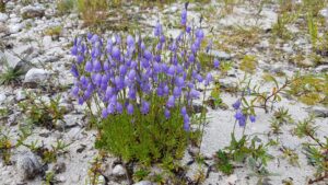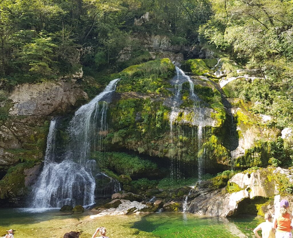 Doch ich nehme euch wieder zurück an den Oberlauf der Soca. Aus dem karstigen Gebirge wird sie von vielen Flüssen gespeist, die sich aus großen Höhlen in die Landschaft ergießen oder aprupt aus dem Gestein springen und als Wasserfall zutage treten. Ein Tag unseres Urlaubs war den Wasserfällen gewidmet. Auf dem Weg zu einem weiter oben in den Bergen durchwanderten wir einen Birkenwald, in dem viele, kleine, dunkelrosa Alpenveilchen wuchsen. Ein wunderbarer Anlick in dieser Kombination: weiße Birkenstämme, dunkles Moos und strahlendes Rosa der Alpenveilchen. Ich konnte mich gar nicht satt daran sehen! Da waren viele glückliche Naturwesen zugange, die sich auch über die Bewunderung der Menschen freuten!